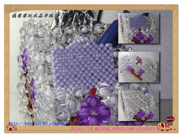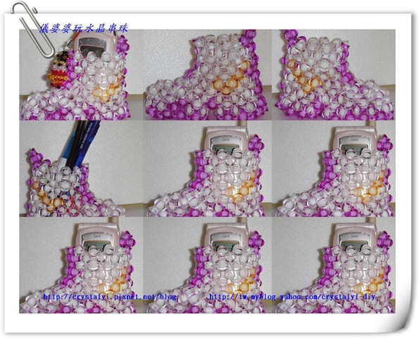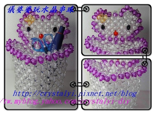 接下來要做的是有些難度的Kitty 心型筆筒,為何說是有些難度呢?原來呀做好後才發現Kitty 頭軟綿綿的站不起來,在忍不住的情況下只好把它拆掉重新再串一次,有了之前的經驗,在重串的時候儀婆婆做了些補強,這次總算不會再往後倒了;Kitty 心型筆筒的特色是除可當筆筒外,Kitty頭後面還可當名片夾喔。