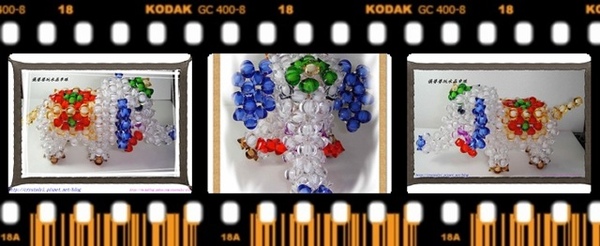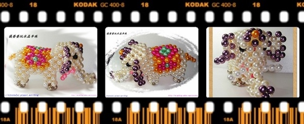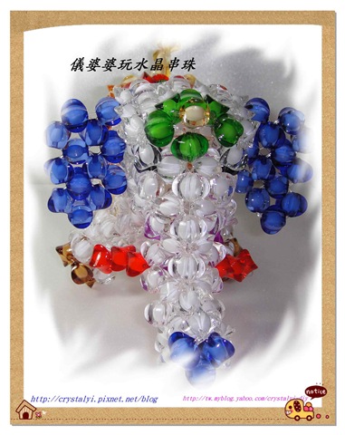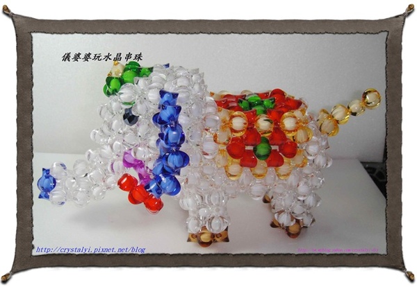星期天晚上看到昨天未完成的大象,想想也該上工把它完成啦,於是又拿起我的材料盒一珠一珠的往大象身體加,由於昨天已完成了二分之一,理說今天應該能很快的將作品完成,但天不從人願,再穿到象嘴時發前昨天少的粉紅色珠珠正是用在此處,這下可好,紫色的象嘴可能只有儀婆婆串出來不知會是長甚麼樣,不管三七二十一,還是給他很努力的串下去,雖然今天的象頭串的並不是那麼的順利,因為在串象牙的時候又發現怎麼拉都不好看,索性把象牙這個部分留到最後在串上去,好不容易都串玩收線後,又很怕大象頭太重會站不穩,不過也許是儀婆婆平時有燒香,這隻大象站的可真是穩咧。